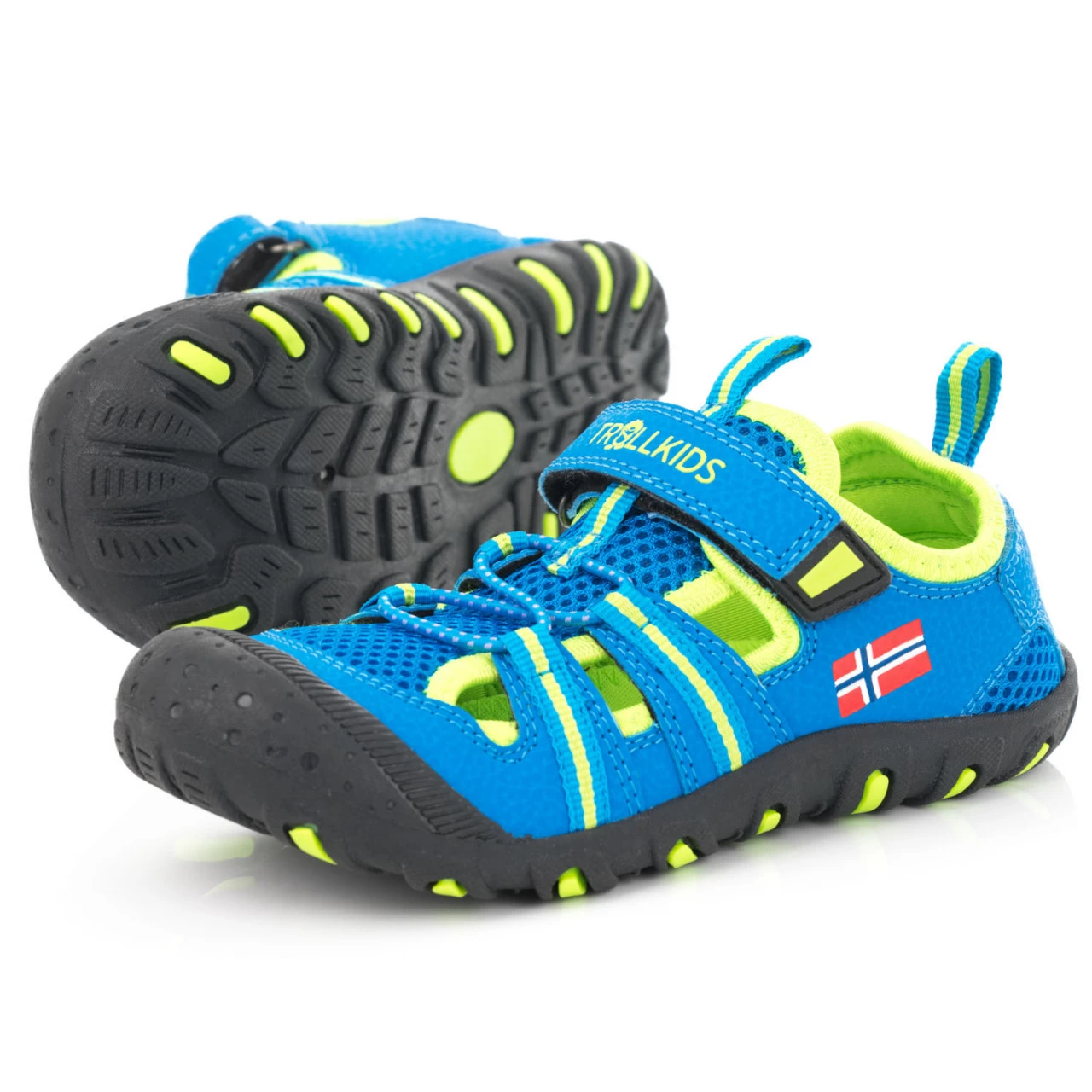 Die Trollkids Sandefjord Sandal Sommersandale besitzt eine gedämpfte Laufsohle. Zu den Ausstattungsmerkmalen gehören Zehenschutzkappen, Klettverschlüsse über dem Spann und Schnellschnürsystem. Die Zunge ist aus atmungsaktivem Mesh.
